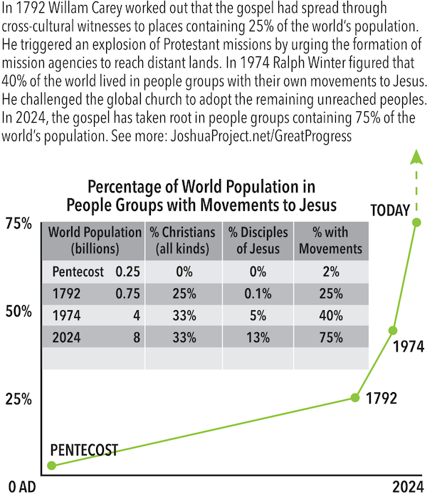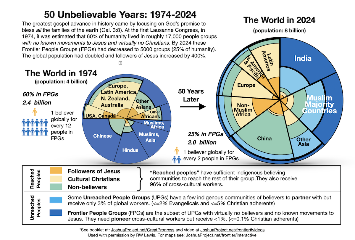 Fifty years later, the kingdom has spread immensely, but frontiers still exist. No longer is 60% of the world’s population in people groups with no churches or kingdom advance (1974, 2.4 billion people). Now only 25% of the world’s population is without any known growing indigenous witness (2 billion people). Given that the population of the world has doubled in the same 50-year period (4 billion in 1974, 8 billion in 2024), this means the gospel is spreading at an exponential rate into people groups beyond the edges of the kingdom.