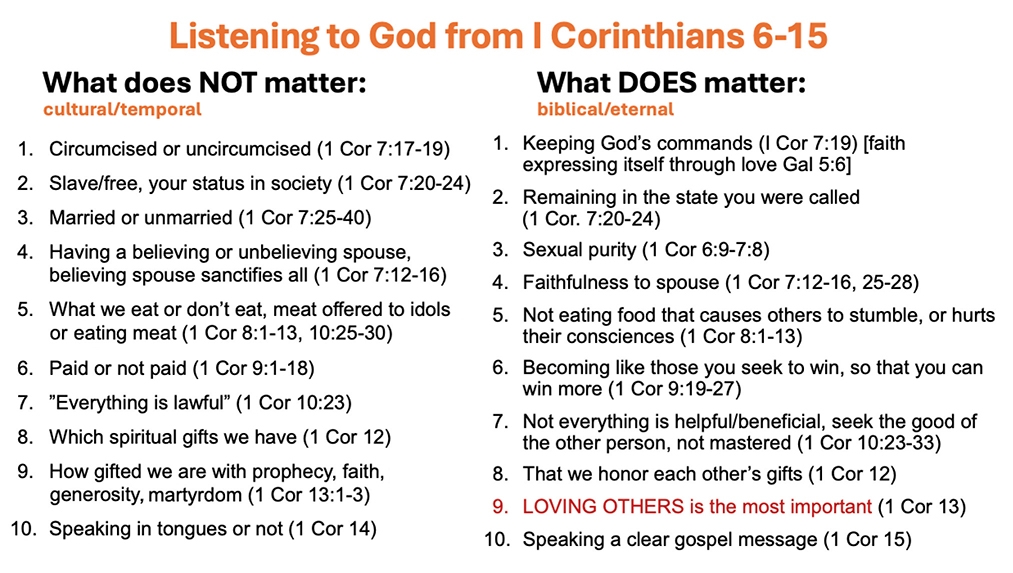 In 1st Corinthians, Paul wrote that it did not matter if people were circumcised, slaves, married, had a believing spouse, ate meat sacrificed to idols, nor whether they were paid to spread the gospel. It also did not matter whether they had spiritual gifts (and what kind), whether they had faith (and how much), nor if they generously gave to the poor. What did matter was whether they were transformed, born again as a new creation (Gal 6:15–18), obedient to God (1 Cor 7:19), sexually pure, faithful, not hurting or causing others to stumble, not mastered by anything, honoring the gifts God gave others, speaking a clear gospel message, and above all else—loving others (1 Cor 13, Gal 5:6).